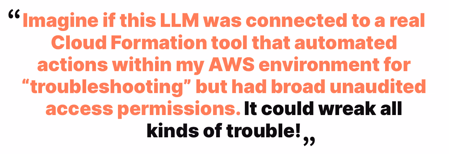 Imagine if this LLM was connected to a real Cloud Formation tool that automated actions within my AWS environment for “troubleshooting” but had broad unaudited access permissions. It could wreak all kinds of trouble! This is the kind of unexplainable behavior that attackers can exploit by merely trying different types of malicious prompts in the space of only five minutes.